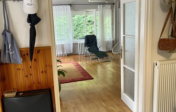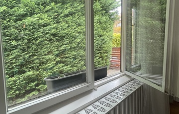 A két hálószoba az utcára néz a nappali és a konyha a kertre.