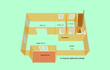 A földszinten nappali-étkező-konyha, hálószoba, fürdőszoba, tároló, közlekedő, lépcsőház található.