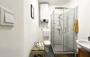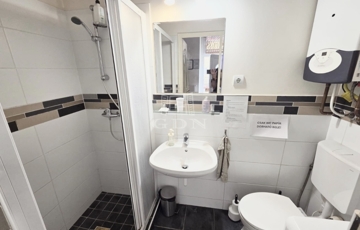 A kisebb szobából közelíthető meg a hátsó fürdő, melyben a melegvizet villanybojler biztosítja. A nyári melegben a klíma gondoskodik a kellemes hőmérsékletről.