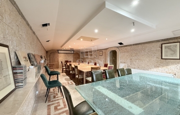 Pinceszint : Az épület alatti pinceszintre került a kazánház, borospince, mosdó, tárolók, fegyverszoba, és a hatalmas méretű tárgyaló/étkező. Ennek a szintnek 2 bejárata van. A lenti részből a télikerten keresztül jutunk a földszintre.