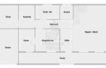 Belépve egy galériával egybeépített amerikai konyha-nappaliba érkezünk, mely a közösségi élet szíve. Itt található még egy dolgozószoba (mindkét helyiség laminált padlóval), egy modern fürdőszoba-WC és egy praktikus kamra. A ház hátsó része ad helyet a kívülről is megközelíthető kazánháznak, tárolónak és garázsnak.