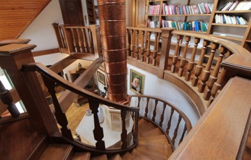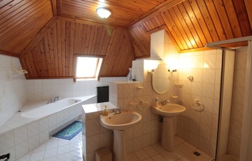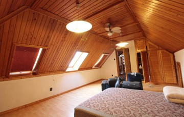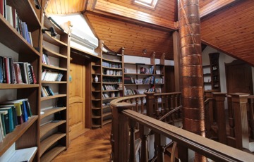 Masszív tölgyfa lépcső vezet az emeleti galériába, ahol egyedi könyvespolcok mellett haladva három szoba, mosókonyha és egy további fürdőszoba (kád, tusoló, WC) található.