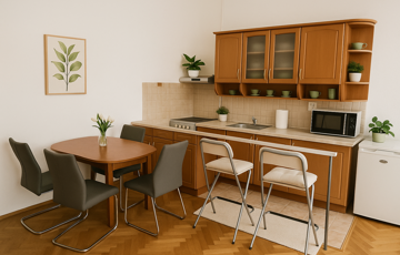 egész nap világos, mégis csendes, mivel a forgalomtól távolabb eső, nyugodt utcára néz. A 3. emeletnek és a magas belmagasságnak köszönhetően tágas, levegős, otthonos tér fogad.