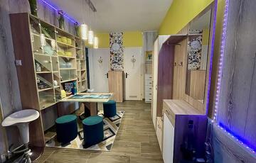 A nappaliból egy külön bejárható, tágas gardrób lett leválasztva, amely praktikus tárolási lehetőséget biztosít.