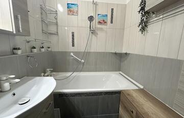 A fürdőszoba modern, új akrilkádat és ízléses burkolatokat kapott, a mosógép kiállása pedig a gardrób eredeti helyén került kialakításra.