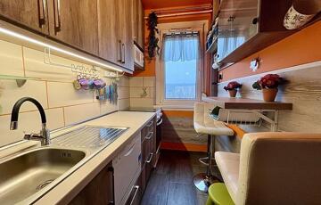 A konyha is teljesen megújult: új burkolatok, modern konyhabútor, beépített mosogatógép és egy kényelmes bár/reggeliző pult teszi teljessé a teret.