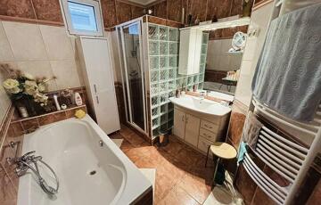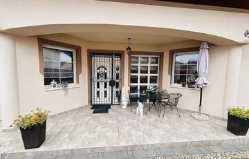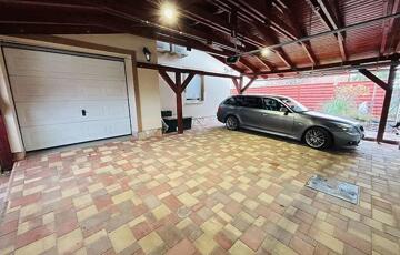 A parkolás teljes mértékben megoldott: az 50 m²-es, fedett viacolor beállón akár három autó is kényelmesen elfér, a garázs elektromos, 8 méter széles szekcionált kapuval felszerelt, a ház előtt pedig további két parkolóhely áll rendelkezésre. A napelem és hőszivattyú kiépítése előkészítve, a H-tarifa igénylése folyamatban, a puffertartály már beépítésre került.