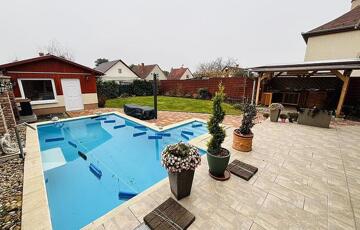 A hátsó kert igazi privát wellness- és pihenőzóna. Az 50 m²-es fedett teraszról egy 7,5 × 3,5 méteres, 1,6 m mély, kiváló felszereltségű fűthető medencéhez jutunk, mely ellenáramoltatóval, automata vegyszeradagolóval, vízlágyítóval, valamint nyak- és hátmasszírozóval is rendelkezik. A gépészetet egy külön, 25 m²-es melléképület rejti, ahol egy szauna is kialakításra került A kertben ezen kívül fedett kerti sütögető is szolgálja a maximális kikapcsolódást.