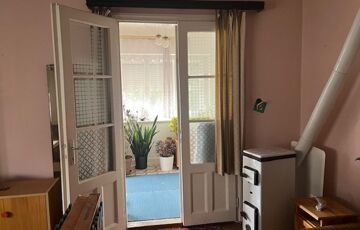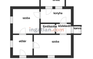 Elosztás:-fedett előterasz, előszoba, 2 külön bejáratú nagy szoba, közlekedő,kamra, fürdőszoba, étkezős konyha. Konyhából kijárat a hátsó fedett teraszra.