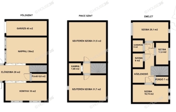 emeleten: három hálószoba, egy dolgozószoba és fürdőszoba található