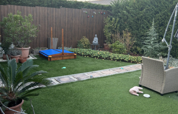 A kertbe elektromos kapun keresztül jutunk, ahol 2 személyautónak fedett beálló lett kialakítva. A hangulatos kert meghitt intimszférát teremt, melynek része egy tároló is.