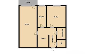 2 szoba, étkező, konyha, kádas fürdőszoba, mellékhelyiség, közlekedő, előszoba, 4 m2-es erkély.