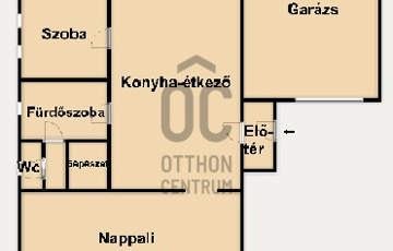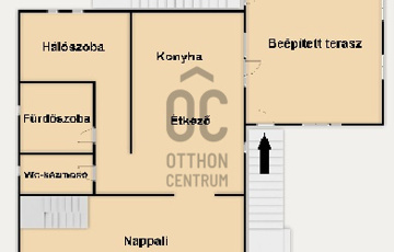 Magasföldszint helyiségei: beépített terasz/ előszoba, konyha-étkező, nappali, hálószoba, fürdőszoba, wc, terasz.