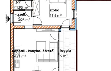 A 1 db amerikai konyhás nappalival, 1db hálószobával, 1 db fürdőszobával, közlekedővel, loggiával rendelkezik.