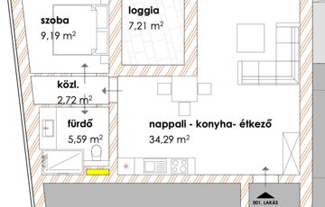 A 1 db amerikai konyhás nappalival, 1db hálószobával, 1 db fürdőszobával, közlekedővel, loggiával rendelkezik.
