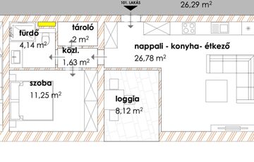 A 1 db amerikai konyhás nappalival, 1db hálószobával, 1 db fürdőszobával, közlekedővel, loggiával rendelkezik.