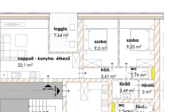 A 1 db amerikai konyhás nappalival, 2db hálószobával, 1 db fürdőszobával, közlekedővel, loggiával rendelkezik.