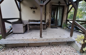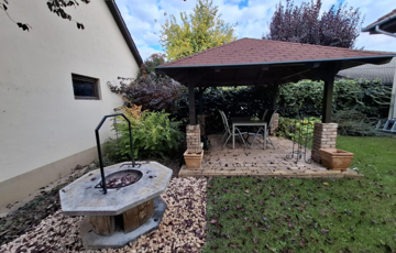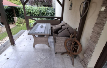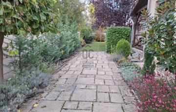 A családi házhoz tartozik egy nagyméretű, rendezett, parkosított kert . A kert végén helyezkedik el a szerelőaknás duplagarázs tárolóval, a kettő együtt összesen 44 nm nagyságú. A kertben helyet kapott egy filagória és egy sütőhely is.