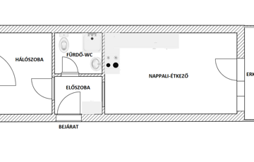 A lakás az első emeleten található, elosztása szerint: nappali-konyha-étkező, hálószoba, fürdő-wc, előszoba helyiségekből áll.
