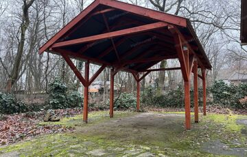 A csendes, madár csicsergős telken, épült fedett kocsi beálló is, mely akár több módon hasznosítható.