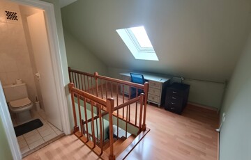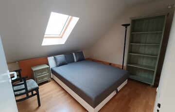 - Felső szint, (tetőtér) helyiségei: előtér, két hálószoba, WC kismosdóval.