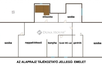 Az emeleten előszoba, egy tágas amerikai konyhás nappali és három hálószoba található. Az egyik szoba erkélyes, a legnagyobb szoba pedig saját gardróbbal rendelkezik.