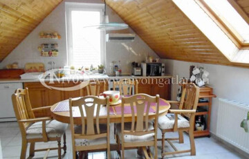 Veszprém abszolút belvárosában, patinás megjelenésű polgári házban, 3 szintes épület tetőterében, 147 m2-es 3 szobával rendelkező (két egymásból nyíló) szép állapotú tégla lakás. Az ingatlan részben bútorozott, beépített szekrényekkel ellátott, az ablakok redőnyökkel, a lakás klímával, riasztóval felszerelt.