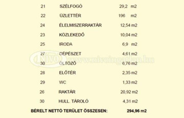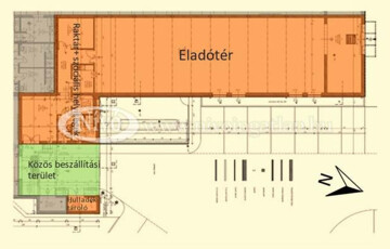 Az ingatlan nettó alapterülete összesen: 294,96 m2, ebből az üvegportállal ellátott eladó tér 196 m2-es. Tartozik hozzá raktárak, iroda, öltöző, szociális blokk és teakonyha is.