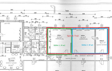 Az iroda blokk egyben 75 m2 is kivehető, illetve ebből külön is bérbe vehető egy egy helyiségből álló egy 30 m2 iroda, vagy egy két helyiségből álló (30 m2 és 15 m2, a hirdetett) 45 m2-es iroda is. A helyiségek a folyosóról külön ajtóval megközelíthetőek.