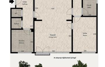 A lakás központi részén egy keleti fekvésű, franciaerkéllyel is rendelkező 17 nm-es nappali található, amely szomszédságában találjuk a 12 nm-es hall-t és a 13nm-es hálószobát.