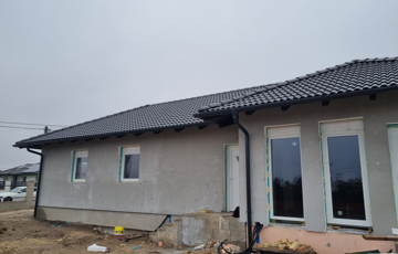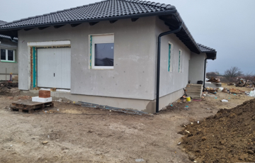 főfal: 30 cm tégla, 15 cm dryvit szigetelés, műanyag nyílászárók, fűtés: padlófűtés- hőszivattyú,