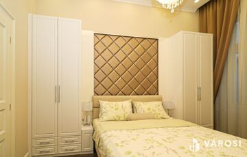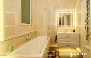 Az egész lakásra jellemző az elegancia, rejtett világítások, csillárfény, bézs–arany tónusok, nagy ablakok, vastag drapériák.