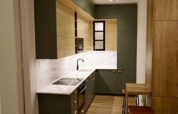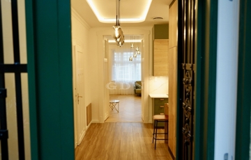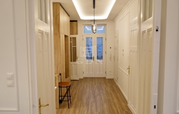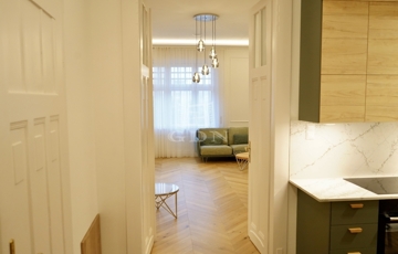 A 3,2 méteres belmagasság, a klasszikus halszálkamintás tölgyfa parketta és a felújított, patinás beltéri ajtók időtálló nagypolgári hangulatot teremtenek, amely harmonikusan kapcsolódik a modern megoldásokhoz. Az enteriőr kifinomultságát designlámpák és gondosan kiválasztott burkolatok erősítik, egységes és elegáns összképet alkotva.