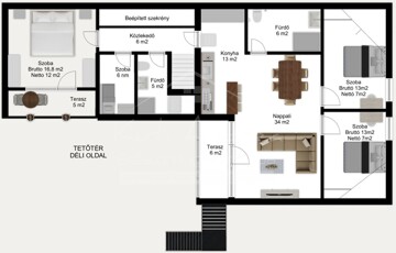 A felső lakásban elektromos fűtőpanelek kerültek felszerelésre, amelyek lehetővé teszik, hogy ez a lakás önállóan, a gázkazán használata nélkül is fűthető legyen, így különösen praktikus megoldás lehet elkülönített használat vagy kiadás esetén.