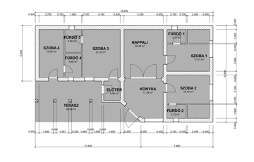 A ház alapterülete 120 nm, elosztása: nappali-konyha-étkező egy légtérben, 4 hálószoba fürdőszobákkal. Mindegyik hálószobának van saját fürdőszobája. Alaprajz a fotók között.