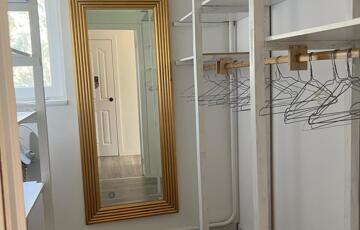The 2 bedrooms have separate entrances, the living room has built-in cabinets for storage, and there is also a wardrobe room.
