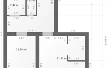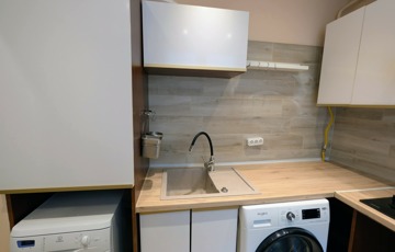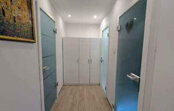 A loggia-ról nyíló 55 nm-en található kettő külön bejáratú, kényelmes méretű szoba (a nagyobb szobából erkély nyílik); jó méretű konyha; kádas fürdőszoba és külön WC.