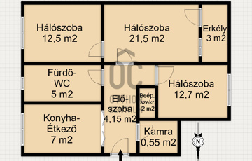 helyiségek: 3 hálószoba, ebből 2 szoba külön nyílik, konyha-étkező, közlekedő, kamra, fürdőszoba-WC