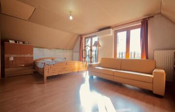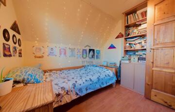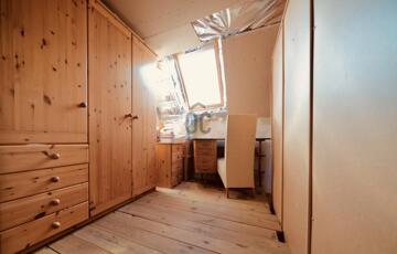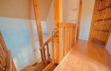 -emelet helyiségei: egy nagy világos nappali, hálószoba, dolgozó szoba, fürdőszoba-fürdőkáddal kapott helyet