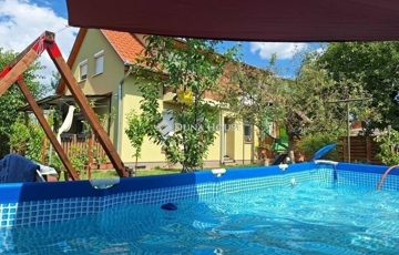 Rendezett kert gyümölcsfákkal, virágokkal, mászóka csúszdával, így gyermekes családok számára is ideális, fúrt kútról öntözhető kert gazdaságos fenntartás