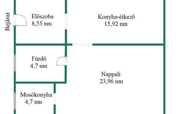 Elosztás: előszoba, konyha–étkező, nappali, zuhanyzós fürdő-WC, mosókonyha.