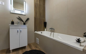 A lakás frissen felújított, igényes anyagokkal, letisztult, mégis karakteres dizájnnal. A tágas nappali és a konyha egy légteret alkotnak, így kellemes, otthonos tér jött létre. A fürdő és a WC külön helyiségben található, ami tovább növeli a kényelmet és praktikusságot.