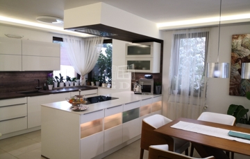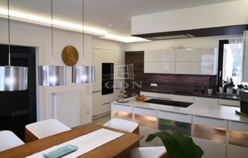 A modern, Siemens gépekkel felszerelt Nobilia konyha és a stílusos étkező mellett hat tágas szobával, elegáns gardróbbal, két exkluzív fürdőszobával, valamint négy WC-vel és tágas, világos terekkel rendelkezik. A középső szinten magas minőségű, gyönyörű parketta a burkolat, a prémium életérzés a ház minden apró részletében jelen van, amit az alábbi felszereltség is erősít.