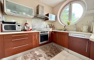 Az alsó szint praktikus kiegészítő funkciókat kínál: háromállásos garázs, borospince, konditerem és több tárolóhelyiség áll rendelkezésre. A gondozott kert és a teraszok Szentendrére és a környező zöldövezetre nyíló panorámája természetes része a mindennapoknak.
