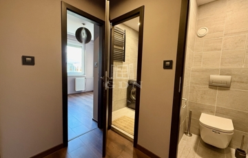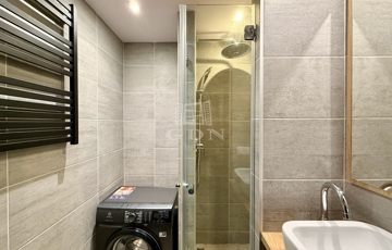 A hálószoba csendes, jól berendezhető, a fürdőszoba pedig modern, visszafogott stílusú, épített zuhannyal és minőségi burkolatokkal. A mosógép diszkréten, beépítve kapott helyet, a külön WC pedig érezhetően növeli a komfortot.