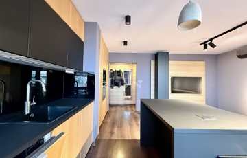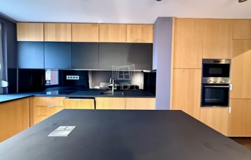 A nappali és a konyha egy légtérben kapott helyet, mégsem zsúfolt. A teljes falon futó konyhabútor, a nagy munkafelület és a szigetes kialakítás jól használható, mindennapi életteret ad. Innen közvetlenül elérhető az erkély, ami kényelmesen használható – akár egy gyors reggelihez, akár egy esti leüléshez.