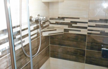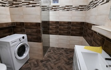 A fürdőszoba zuhanyzós kivitelű, mosógép van.