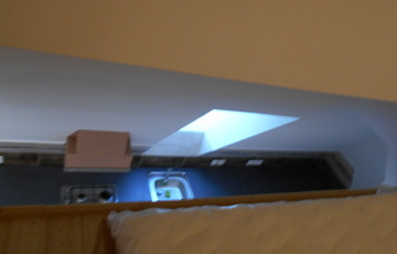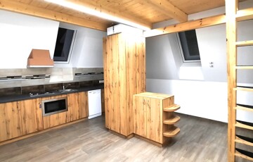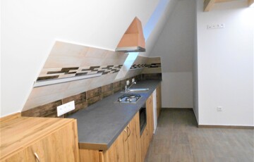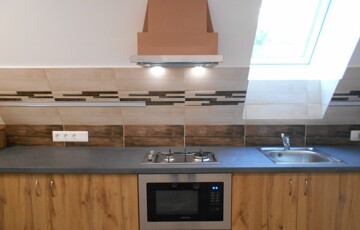 A tetőtéri lakásban a konyha teljesen felszerelt, mosogatógép, mikró, 2 lapos gáz. Az asztal, székek, hűtő, TV .