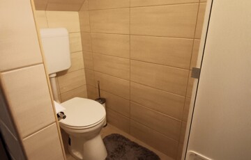 - Burkolatok: Az emeleten két hálószoba burkolata laminált parketta, a többi helyiség magas kopásállóságú járólappal burkolt.
