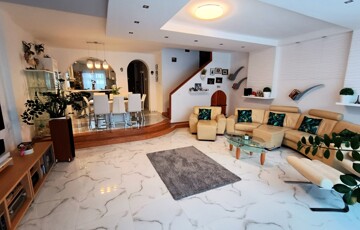 - Alsó szint helyiségei: előszoba, konyha, étkező és nappali egyben, zuhanykabinos fürdőszoba + WC. Az előszobában igényes beépített szekrények találhatók.